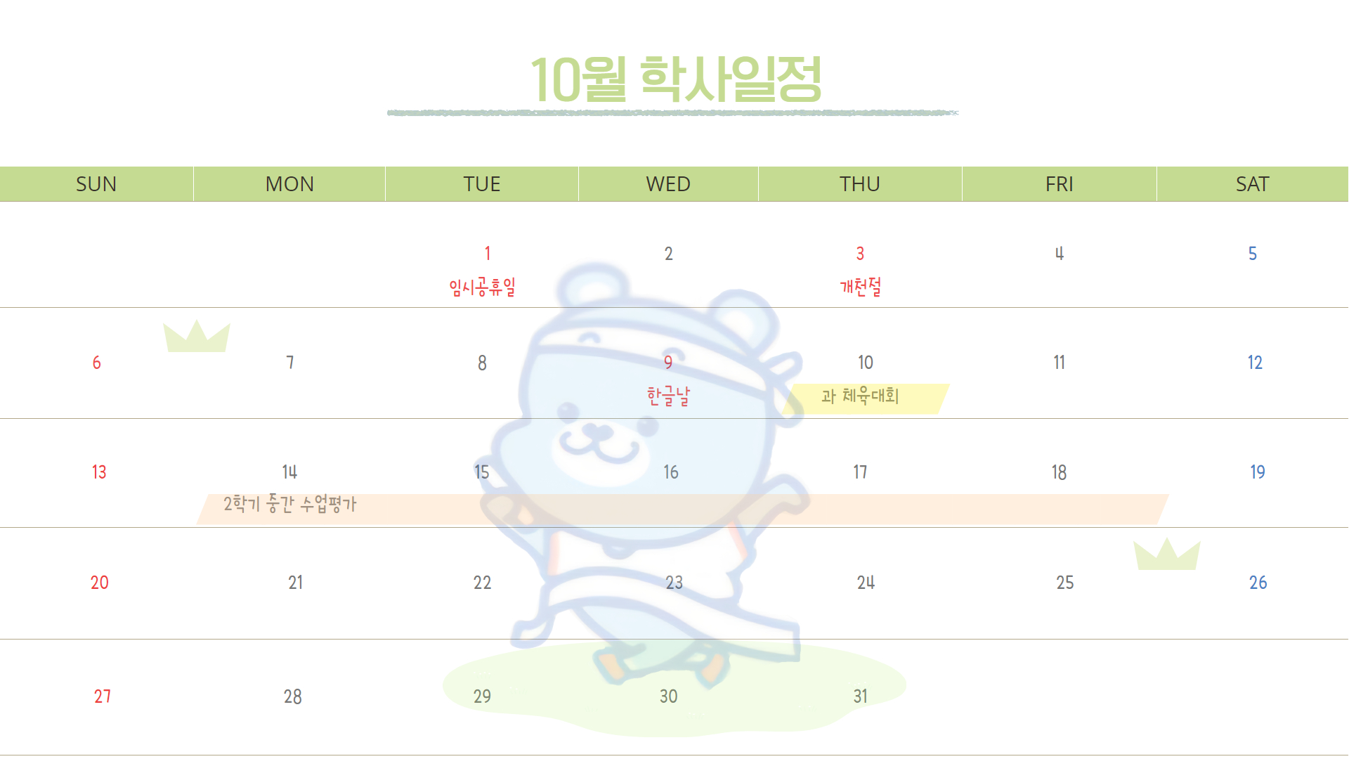 10월 학사일정입니다! 10월에는 우리 학과의 체육대회가 예정되어 있으니 많은 참여 부탁드립니다. 또한, 중간고사 기간과 관련된학사일정을 참고해 주시기 바랍니다. ✅️ 10월 10일 체육대회 👟 ✅️ 10월 14일~18일 2학기 중간 수업평가 ✍️