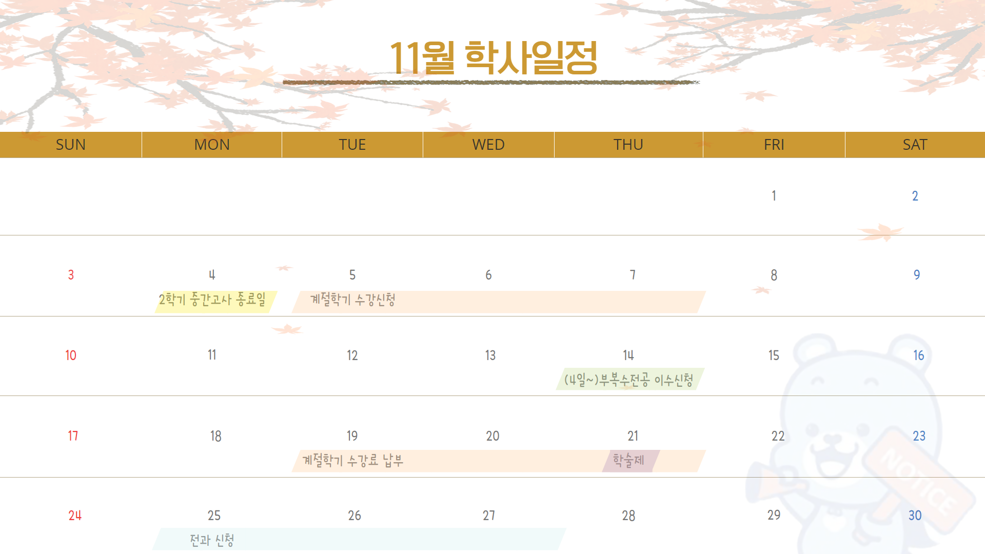 11월 학사일정입니다. 과 학술제가 예정되어 있으니 많은 참여 부탁드립니다!